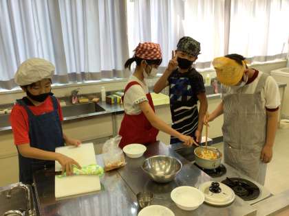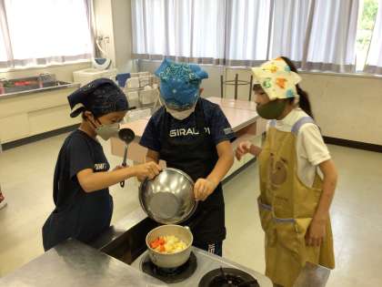 キャンプに向けてカレーライスを作りました。グループで協力して野菜を切ったり、炒めたりしました。ルーを入れると、「いい匂いがするー」「美味しそう!」と大喜びでした。