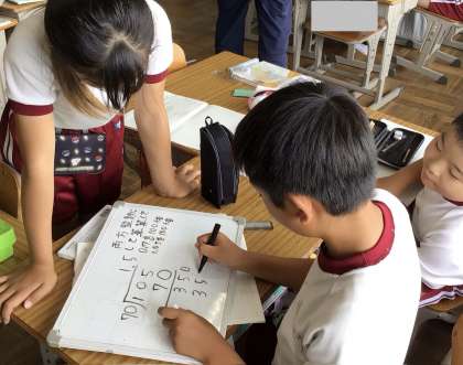 5年生 算数 公開日 2024/06/17 更新日 2024/06/17 お知らせ 5年生の算数「小数のわり算」の授業の様子です。 1.05÷0.7の計算の仕方を考えていました。グループで話し合い、ホワイトボードにまとめました。わり算では、わる数とわられる数に同じ数をかけても答えが同じになることをつかい、答えを導いていました。