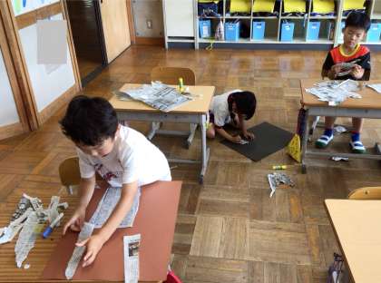 1年生 図工 公開日 2024/06/24 更新日 2024/06/24 お知らせ 1年生の図工「やぶいたかたちかわみつけたよ」の授業の様子です。 新聞紙を自由に破き、その形から何ができるか考え、画用紙に貼って表現していました。大変楽しそうに取り組んでいました。