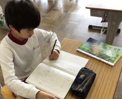 3年生の国語の授業の様子です。 詩を書いていました。書いた詩を先生に見せ、楽しそうに説明する姿も見られました。