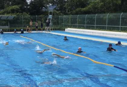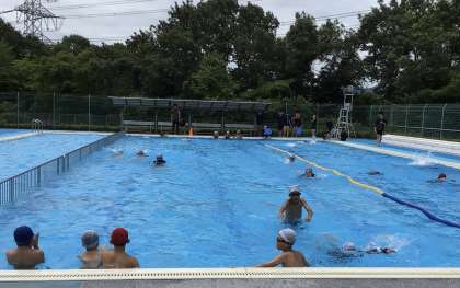 コースに分かれて泳いでいました。今日は予想以上に晴れ渡り、途中で水分補給しながら、大変気持ちよさそうに泳ぎ続けていました。
