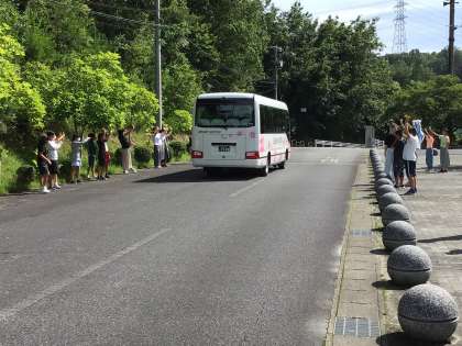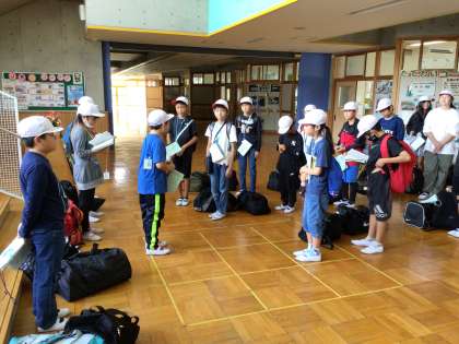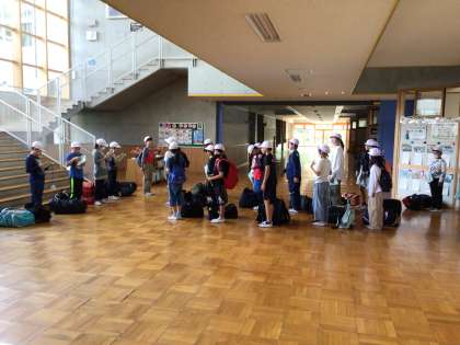 出発式の様子です。 暑い日になったため、ホールで出発式を行いました。6年生に見送られ、皆元気に出発しました。