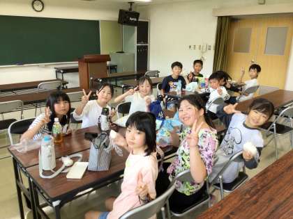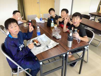 オリエンテーリングを終え、涼しい研修室でおにぎり弁当を食べました。
