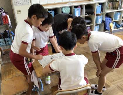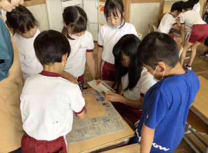 図書館司書の先生に教えていただきました。新聞パズルに苦戦しながら、記事の配置を学んでいました。