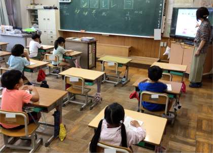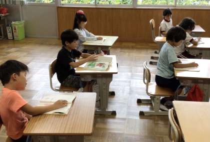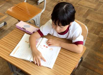 1年生の国語の授業の様子です。 「たべもの」という詩を指差ししながら、一生懸命読んでいました。