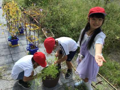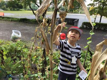 畑でアサガオやフウセンカズラの種を取ったり、夏休みの間に伸びてしまった雑草を抜いたりしていました。たくさん種が取れて嬉しそうでした。