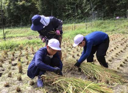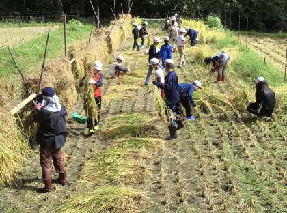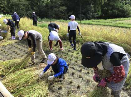 5月に植えた苗が大きく育ち、今日、稲刈りをしました。ボランティアの方に教えていただくことで、ぎこちなかった鎌の使い方がだんだん上手になり、無事に稲を刈ることができました。刈るだけでなく、まとめてきつく縛る必要もあり、大変苦労していましたが、暑い中、最後までよく頑張っていました。田んぼを貸してくださった酒井さん、助けてくださったボランティアの皆さん、ありがとうございました。