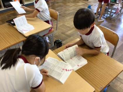 3年生 国語 公開日 2024/09/12 更新日 2024/09/12 お知らせ 3年生の国語の授業の様子です。 友だちと慣用句を使った話を作っていました。どの慣用句を使うか、辞書を見ながら選び、話の内容を楽しそうに相談し合っていました。劇のようにする姿も見られました。