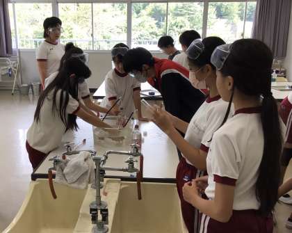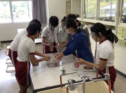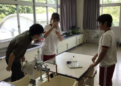 炭酸水に何がとけているのか調べていました。炭酸水の気体を集め、今まで学んできた気体の性質をもとに、石灰水や、線香の火を使って、二酸化炭素が溶けているのか、酸素が溶けているのか調べました。まずは気体を集めるのに苦労していましたが、グループで協力して実験する姿が見られました。
