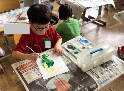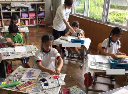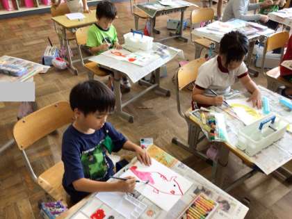 2年生 図工 公開日 2024/09/13 更新日 2024/09/13 お知らせ 2年生の図工の授業の様子です。 「とうさんはタツノオトシゴ」というお話の絵を描いていました。まずは、タツノオトシゴの形をタブレットで調べてからクレヨンで描き、絵の具で色を塗っていました。自分の好きな色で描き、鮮やかなタツノオトシゴの絵ができあがっていました。