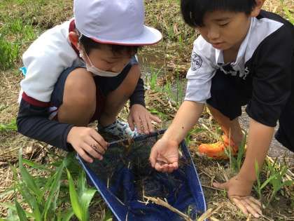 大変良い天気で水温も丁度良く、川の中に入り、夢中になってたくさんの生き物を見つけました。しっかり調査でき、満足そうな笑顔で学校に戻ってきました。