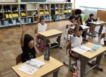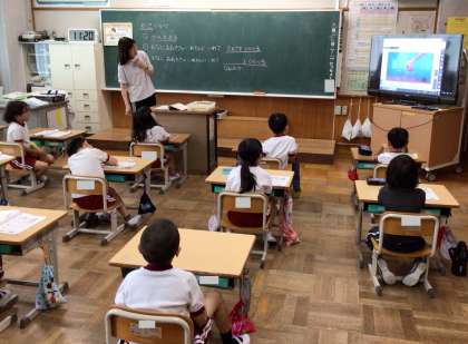 1年生の算数「かさくらべ」の授業の様子です。 2つの水筒に入っている水の量を比べるにはどうしたらよいか考えました。