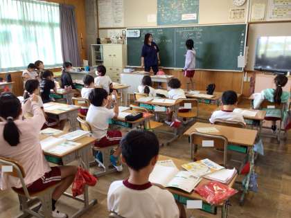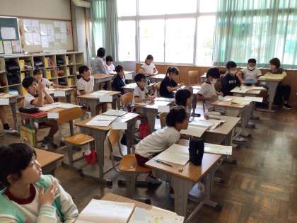 文章問題について、1つの式にする方法を考えていました。黒板の前で説明したり、友達の説明を前のめりで聞いたりする姿が見られました。いくつかの方法があった時、は(はやく)か(かんたん)せ(せいかく)に解ける方法はどれかについても話し合っていました。
