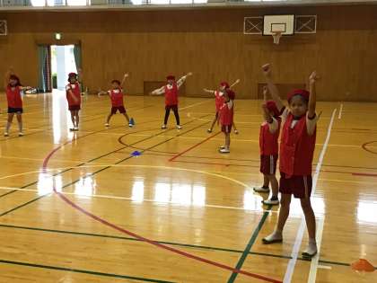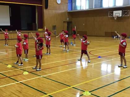 衣装を着てダンスの練習をしていました。ベレー帽がかわいいですね。今日はダンスの途中で移動する場所を一つ一つ覚えていました。少しずつレベルアップしています。2年生が優しく1年生に教える姿も見られました。