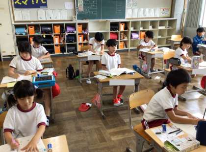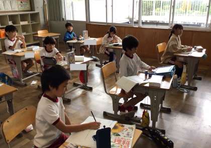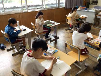 今日は雨降りで「地面の様子と太陽」について学習できないため、「電気の通り道」についての授業です。「豆電球」「かん電池」「導線つきソケット」といったものの名前を学び、ノートに書いていました。