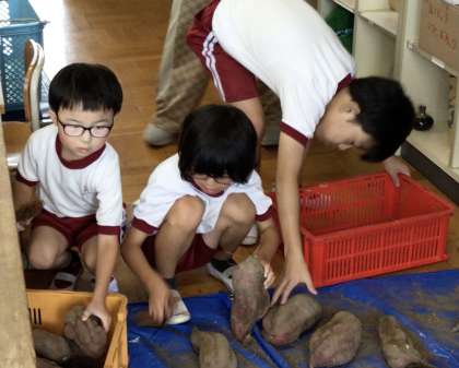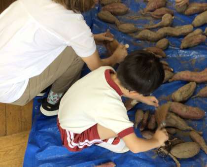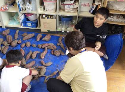 先日掘ったサツマイモの土をはらってきれいにし、あすくす屋で販売するものと学校で調理するものに分けていました。今年は非常に大きなサツマイモがたくさんできました。大きなサツマイモを足湯広場の朝市で販売する予定です。楽しみにしていてください。