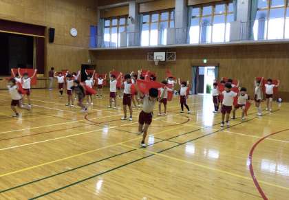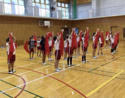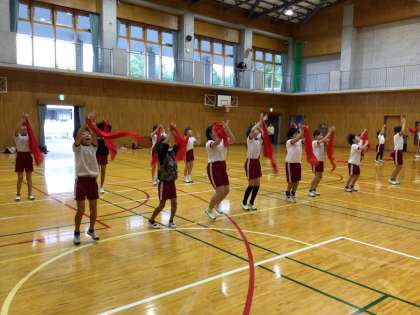 赤い布を振ったり、走ったりしながら、激しい動きで表現運動をしていました。声もよく出ていて、3,4年生のパワーを感じます。