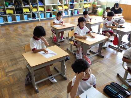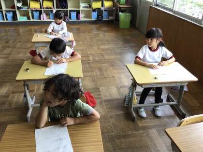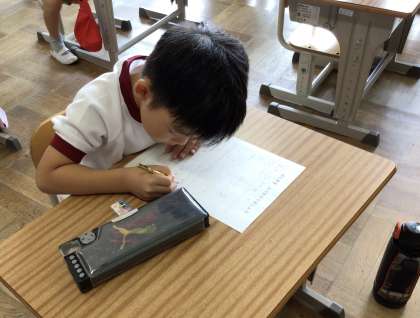 前期を振り返り、学習や生活の中で自分が頑張ったことをプリントに書いていました。「ひらがなをがんばってかいた」「かかりをがんばった」など、1年生になってからできるようになったことを思い出し、一生懸命書いていました。