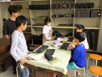 グループで話し合って8章節分の和音の組み合わせを作り、和音に合わせた体の動きを考えていました。音の雰囲気に合わせて元気な動きや悲しそうな動きなどを考え、組み合わせて1つの踊りにしていきます。体を動かしながらグループで相談し合う姿が見られました。