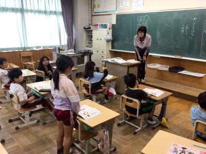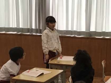話をつなぐ言葉の学習をしていました。相手の話をよく聞き、さらに詳しく知りたい時にはどんな言葉を言えばよいのか、教科書を読んで見つけ、発表していました。友達の発言をよく聞こうとする姿も見られました。