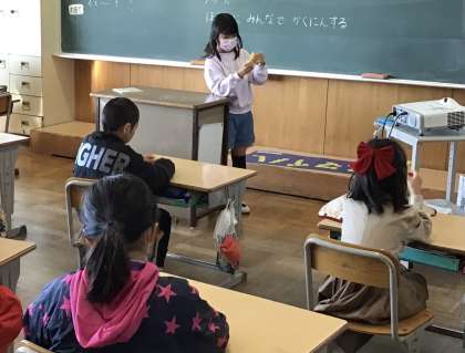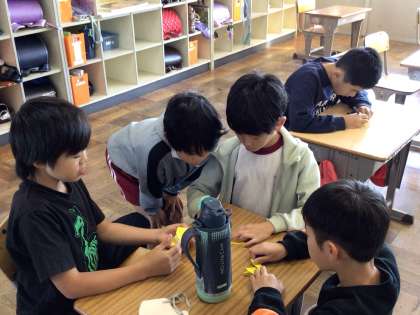 今日の担当の児童が、折り紙でキツネを折る方法を説明していました。友だち同士教え合う姿も見られました。目を描くと、かわいいキツネができあがりました。