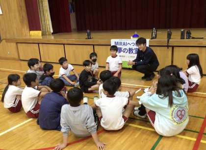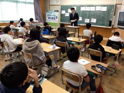 夢先生として、ローイング選手の是谷有輝選手が来てくださりました。はじめは体育館で、全員が手を繋いでゴールをめざすゲームをしました。一人でも失敗するとゴールできないため、何度か話し合いをする中で、声を掛け合い、同じペースにするなどの協力ができるようになり、ゴールすることができました。次の時間は、教室で是谷選手の話を聞きました。うまくいかなかった時も今できることを考え、目の前のことを全力で行う大切さ等を学びました。最後、夢ノートに、自分の夢や今できることを書いて終わりました。子どもたちの今後につながる大変充実した時間を過ごせました。是谷選手、ありがとうございました。