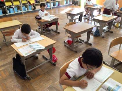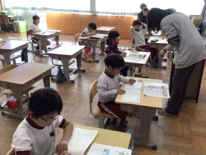 くり下がりのあるひき算の練習問題に取り組んでいました。13ー6の場合、まず13を10と3に分けるのですが、それを「13の下にさくらんぼを作る」と言っています。みんなノートに式を書き、さくらんぼを作りながら、一生懸命計算し、先生にマルをつけてもらっていました。