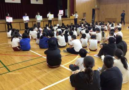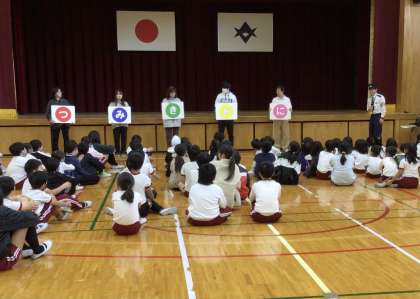 不審者対応訓練 公開日 2024/11/21 更新日 2024/11/21 お知らせ 2名の警察官に来ていただき、不審者対応訓練を行いました。 不審者役の警察官の迫力に圧倒されながらも、対応の教員がさすまたを持って対応しました。最後に、体育館に避難した子どもたちに、警察官から「つ(ついていかない)み(みんなといつもいっしょ)き(きちんとつたえる)お(おおごえでたすけをよぶ)に(にげる)」について話していただきました。
