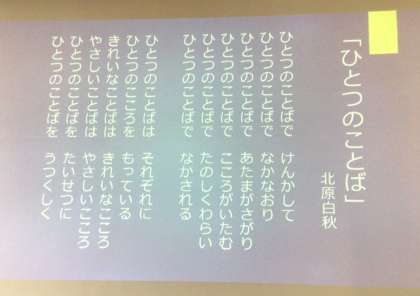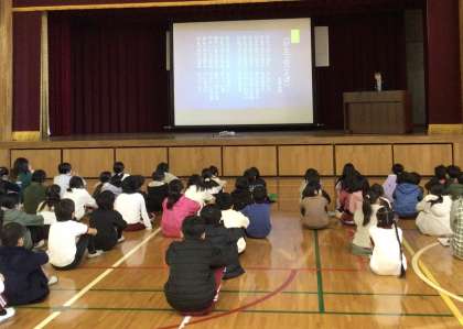 人権週間に合わせ、北原白秋の「ひとつのことば」という詩を紹介しました。「この詩にあるように、言葉は心をもっています。自分が話す言葉ひとつで、人を傷つけることもあれば、温かい気持ちにさせることもできます。そしてその言葉は相手だけでなく、自分の耳が必ず聞き、自分の心も変化させます。自分も相手もやる気が出たり、優しい気持ちになったりするといいですね。ひとつの言葉を大切にしてください。」といった話をしました。真剣に話を聞く姿が見られました。ご家庭でも、ひとつの言葉、人権等について話題にしてみてください。