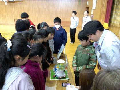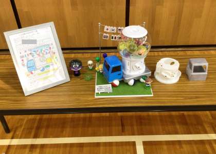 その乗りもののデザイン「幸せはこぶカプセル号」は、実際にトヨタ技術会の方によりミニチュアの実物になり、披露されました。子どもたちは、「すごい!」と感動しながら作品を見ていました。自分が描いた乗りもののデザインが実際に作品になるのは本当に素晴らしいことですね。子どもたちが、ものづくりの楽しさを感じ、夢をもってくれたら嬉しいです。