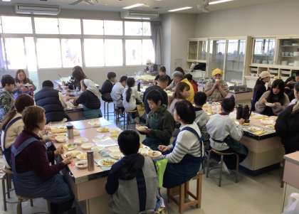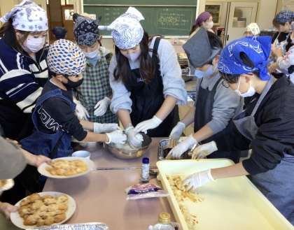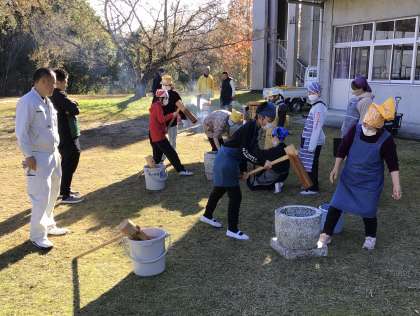 地域の方や保護者の方に助けていただきながら餅つきを行い、じゃがバタベーコンやサラダも作り、皆で一緒に食べました。砂糖醤油やあんこ、きなこ、黒蜜などをつけた、つきたてのお餅は大変美味しく、子どもたちは大喜びでした。