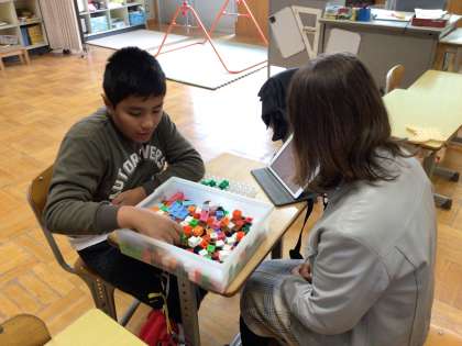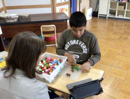 ブロックを使い、色見つけをしていました。正解すると先生に褒めてもらいながら、たくさん見つけて並べようと頑張ってました。タブレットで制限時間を示すことで、時間を意識する姿も見られました。