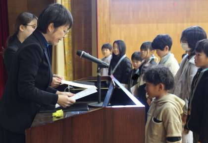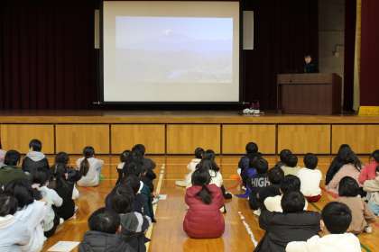 表彰、校長の話、生徒指導担当からの冬休みの過ごし方についての話等がありました。表彰では、マラソン大会、こども乗りデザイン展、赤い羽根協賛作品コンクール、杉田久女俳句大会について表彰しました。子どもたちの嬉しそうな表情が素敵でした。校長の話では「富士山」について話しました。初夢で見ると「不死」「無事」という意味があり、縁起がいいという話をしたり、富士山の高さクイズをしたり、富士山の写真を見せたりしました。子どもたちも、保護者の皆様も、地域の皆様も「不死」で「無事」な良い年を迎えてほしいと願っています。