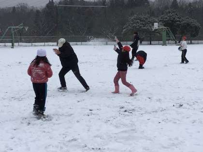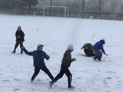 雪合戦で遊ぶ様子もたくさん見られました。にこにこしながら雪を固めて投げたり、逃げたりしていました。先生も一緒に楽しんでいました。