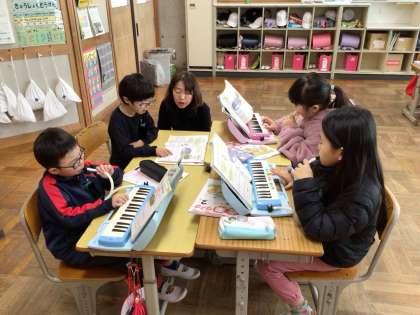 「こぐまの二月」を練習していました。グループごとに歌担当と鍵盤ハーモニカ担当を決め、アドバイスし合いながら練習し、途中で中間発表していました。他のグループの良いところを伝える姿も見られました。