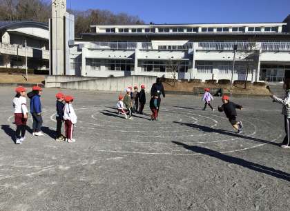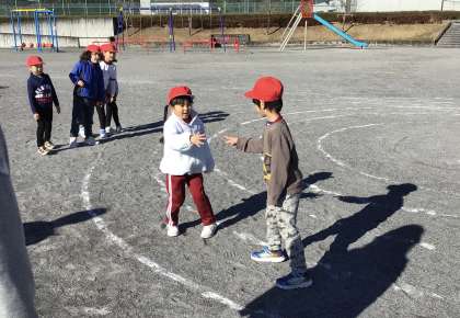 「うずまきじゃんけん」をしていました。地面にうずまきを描いて中心と外に陣地を分け、中と外から一人ずつ渦の道を走り、出会ったところでジャンケンをします。勝つとそのまま進み、負けると次の子が走ります。勝ち進みながら相手の陣地まで行くと、そのチームの勝ちです。渦の道を思い切り走ったり、自分のチームな仲間がじゃんけんに勝つか見守ったりする姿が見られました。勝った時には大きな歓声が上がっていました。