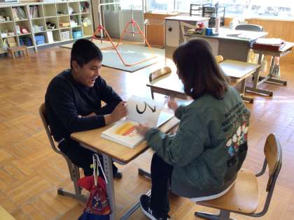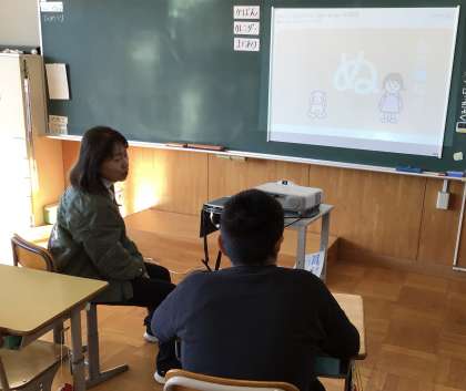 くすのき 国語 公開日 2025/01/22 更新日 2025/01/23 お知らせ くすのき学級の国語の授業の様子です。 ひらがなの学習をしていました。ひらがな学習の音楽を聴いて一緒に歌ったり、絵本と先生の口の動きを見ながら文字を発音したりしていました。上手に言えて先生に褒められると大変嬉しそうでした。