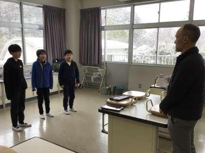 どの都道府県に行きたいか、それななぜかを尋ね、それに答えるCM作りをしていました。グループごとに分かれ、ブライアン先生にアドバイスしてもらいながら練習する姿が見られました。