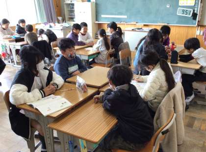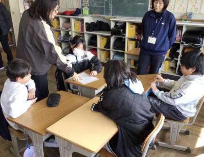4年生 国語 公開日 2025/02/12 更新日 2025/02/12 お知らせ 4年生の国語「調べたことを報告しよう」の授業の様子です。 グループごとに決めたテーマについて、どんなことをアンケートするのか、内容を決めていました。1つのテーマについて詳しく報告するためにはアンケート内容が重要になります。先生のアドバイスも聞きながら、グループで話し合う姿が見られました。