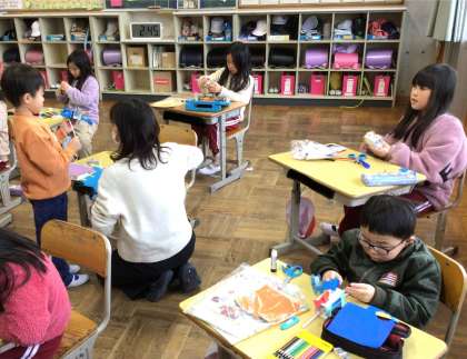 2本のストローを動かすことで上下や左右に動く人形等を作っていました。ストローを上下に動かすと人形の手が動き、手に持っている物も動くようにするなど、実際に動かしてみながら試行錯誤し、より楽しい動きになるよう工夫する姿が見られました。