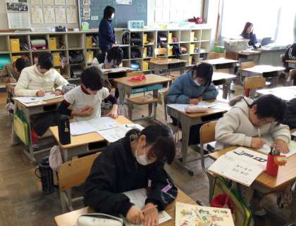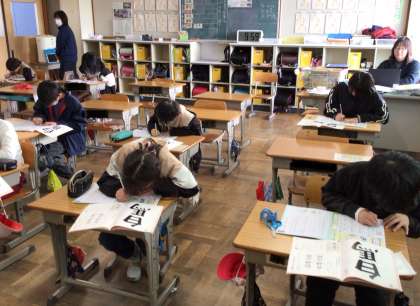 今日は増岡先生の最後の書写の授業でした。漢字とひらがなの大きさ等、今まで学んだことを確認し、丁寧に集中して書いていました。