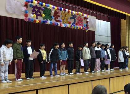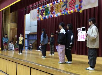 今年度は全校が体育館に集まって行いました。はじめは4年生が企画した「在校生と6年生の思い出クイズ」でした。4年生が、1〜5年生への取材をもとに作った劇とクイズで大変盛り上がり、6年生が大喜びする姿が見られました。