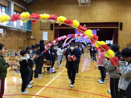 5年生が作成した看板の下で写真を撮り、最後は全校にお礼を言い、拍手で見送られながら花のアーチの下を退場しました。良い思い出ができたことともいます。この思い出を大切に、卒業式まで最高学年として下級生に見本を示し、頑張ってください。