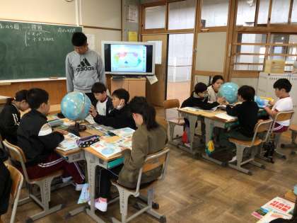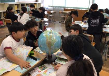 世界地図を興味深そうに見て、様々な大陸を確認したり、簡単な世界地図をノートに描いたりしていました。5年生の社会科の学習を楽しみにする様子が見られました。