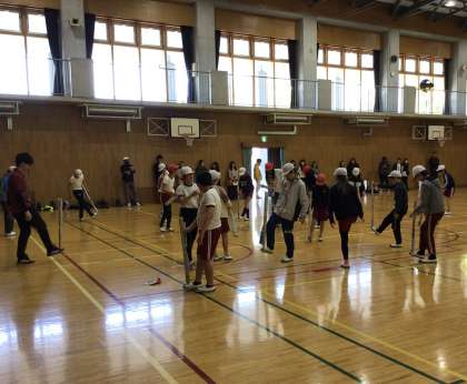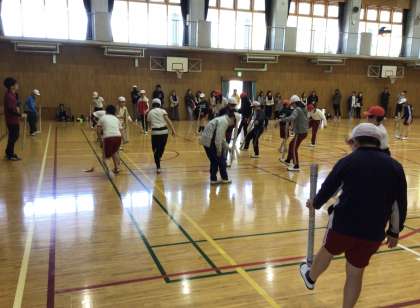 体育の「体づくり」の授業でした。新聞紙を細長く丸めたものを使って、バランスをとる体づくりをしていました。これならどこでもできますね。家でも家族でやってみてください。