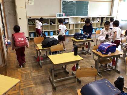 2年生の引き渡し訓練の様子です。 素早く帰る準備をし、昇降口で自分の靴を持ち、体育館に移動し、並びました。