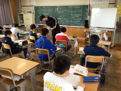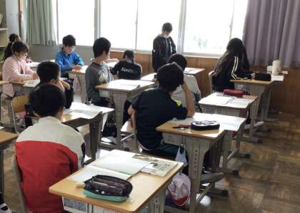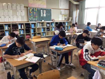 最後のふりかえりを書いていました。黒板にはたくさんの意見が書かれ、様々な意見が出たことがわかりました。真剣にふりかえりを書き、最後は友達の発表を聞く姿が見られました。