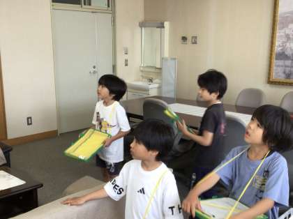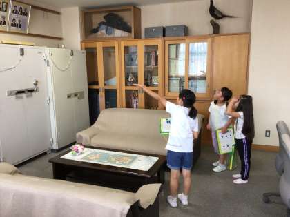 写真は校長室を案内する様子です。2年生が説明し、一緒に校長室に置いてあるものを見ていました。特に、歴代の校長の写真を興味深そうに見ていました。