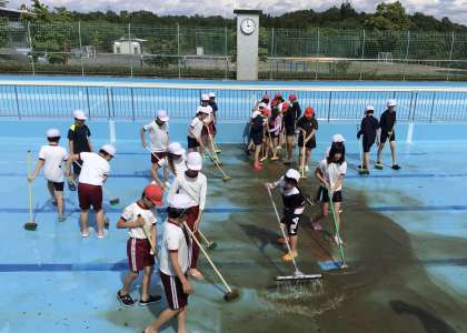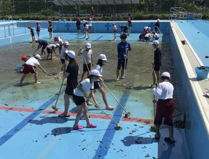 5,6年生 プール掃除 2 公開日 2025/05/28 更新日 2025/05/28 お知らせ 深いプールの掃除の様子です。 泥だらけで、オタマジャクシも泳いでいたプールでしたが、5,6年生が協力し,最後まで粘り強くデッキブラシで磨き、水を流し、落ち葉や泥を取り除くことを繰り返したおかげで、少しずつきれいになっていきました。さすが高学年です。ありがとう!