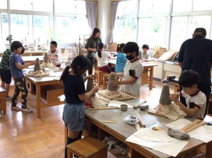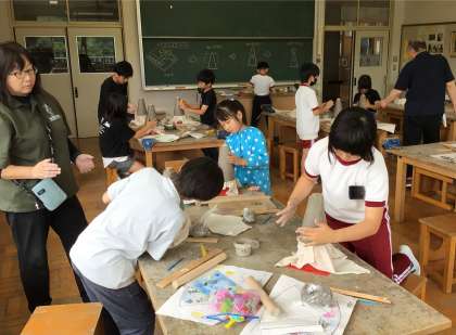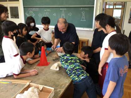 宮島さんの周りに集まって、ランプシェードを作るための様々な技を学びました。子どもたちは熱心にその技を見守っていました。その後、宮島さんに助けていただきながら、型抜きをしたり、模様をつけたりして、工夫して作品を作ることができました。